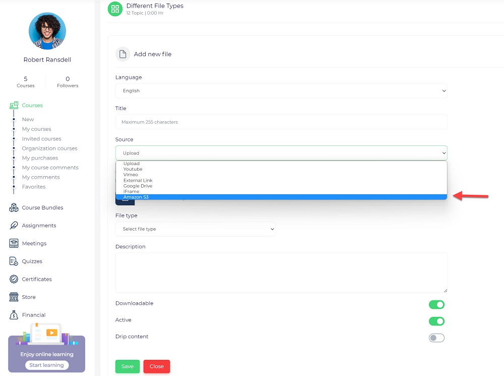 If the instructor selects the S3 during the upload process as the file source, the video file will be directly uploaded to the S3 bucket. It won't be stored on your server.