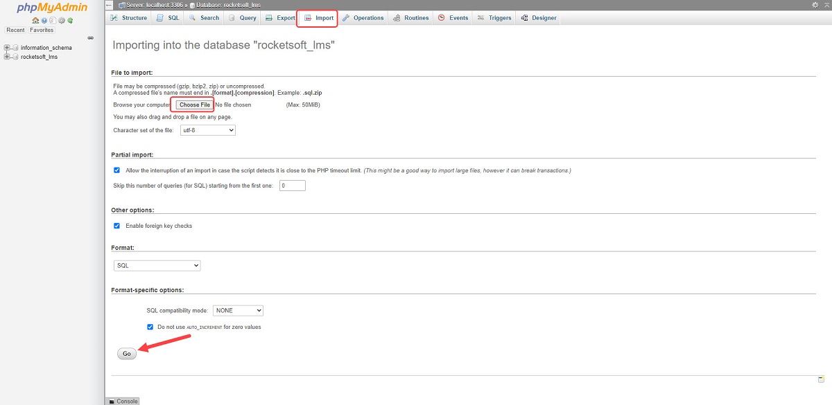 Go to phpMyAdmin and select the created database from the side menu and click on the “Import” tab.